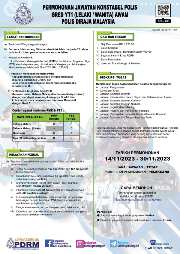 Iklan Jawatan Konstabel Polis Gred YT1 (Lelaki Dan Wanita) Like serta Ikut Facebook Kami, follow Chanel WhatsApp Jawatan Kosong & Telegram Portal SPA9 untuk capaian pantas kekosongan jawatan daripada kami sekarang.