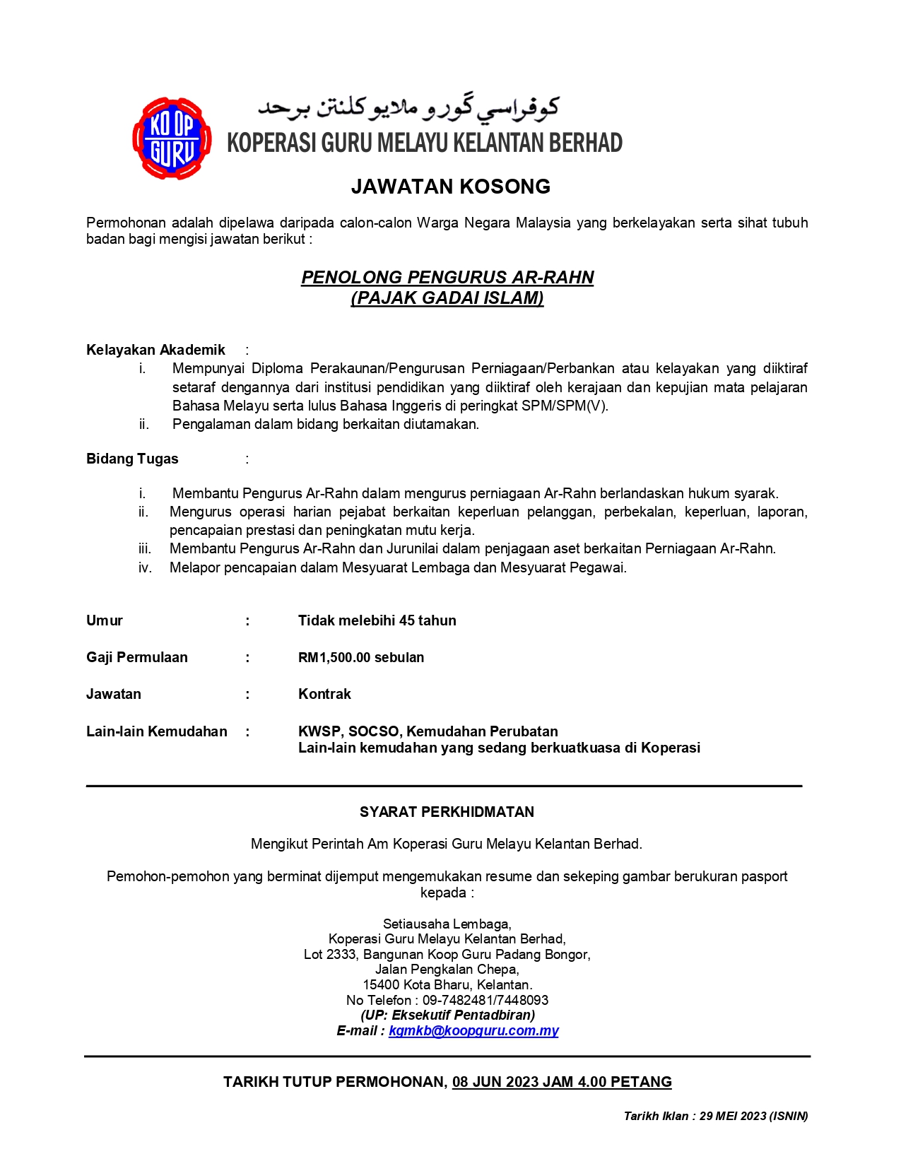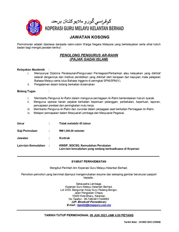 Iklan Jawatan Koperasi Guru Melayu Kelantan Berhad Like serta Ikut Facebook Kami, follow Chanel WhatsApp Jawatan Kosong & Telegram Portal SPA9 untuk capaian pantas kekosongan jawatan daripada kami sekarang.