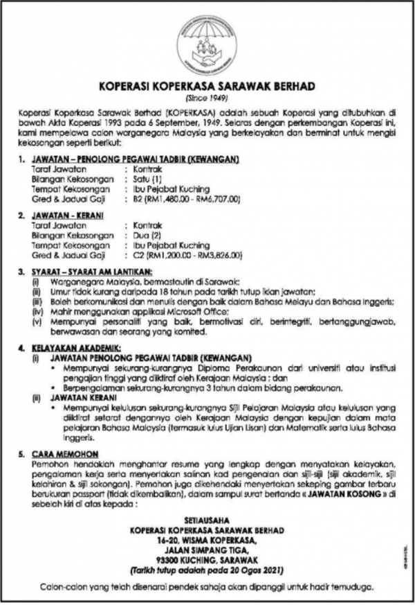 Iklan Jawatan Koperasi Koperkasa Sarawak Berhad Like serta Ikut Facebook Kami, follow Chanel WhatsApp Jawatan Kosong & Telegram Portal SPA9 untuk capaian pantas kekosongan jawatan daripada kami sekarang.