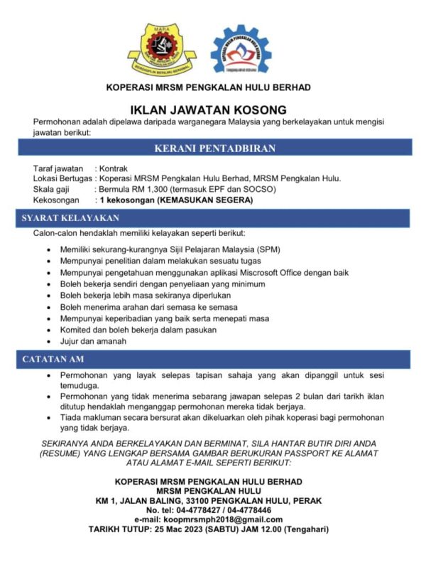 Iklan Jawatan Koperasi MRSM Pengkalan Hulu Berhad Like serta Ikut Facebook Kami, follow Chanel WhatsApp Jawatan Kosong & Telegram Portal SPA9 untuk capaian pantas kekosongan jawatan daripada kami sekarang.
