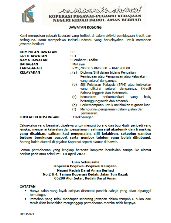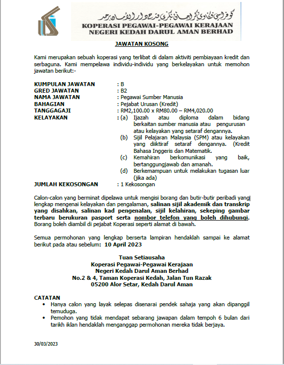 Iklan Jawatan Koperasi Pegawai-Pegawai Kerajaan Negeri Kedah Darul Aman Berhad Like serta Ikut Facebook Kami, follow Chanel WhatsApp Jawatan Kosong & Telegram Portal SPA9 untuk capaian pantas kekosongan jawatan daripada kami sekarang.