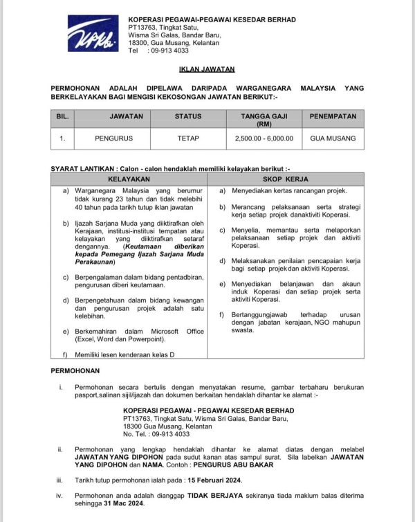 IKlan Jawatan Koperasi Pegawai-Pegawai Kesedar Berhad Like serta Ikut Facebook Kami, follow Chanel WhatsApp Jawatan Kosong & Telegram Portal SPA9 untuk capaian pantas kekosongan jawatan daripada kami sekarang.