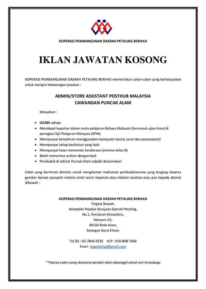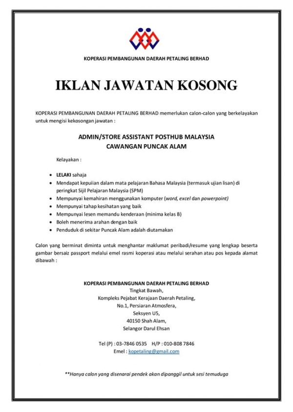 Iklan Jawatan Koperasi Pembangunan Daerah Petaling Like serta Ikut Facebook Kami, follow Chanel WhatsApp Jawatan Kosong & Telegram Portal SPA9 untuk capaian pantas kekosongan jawatan daripada kami sekarang.