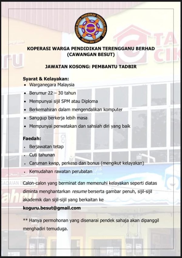 IKlan Jawatan Koperasi Warga Pendidikan Terengganu Berhad Like serta Ikut Facebook Kami, follow Chanel WhatsApp Jawatan Kosong & Telegram Portal SPA9 untuk capaian pantas kekosongan jawatan daripada kami sekarang.