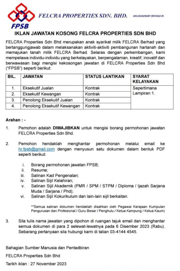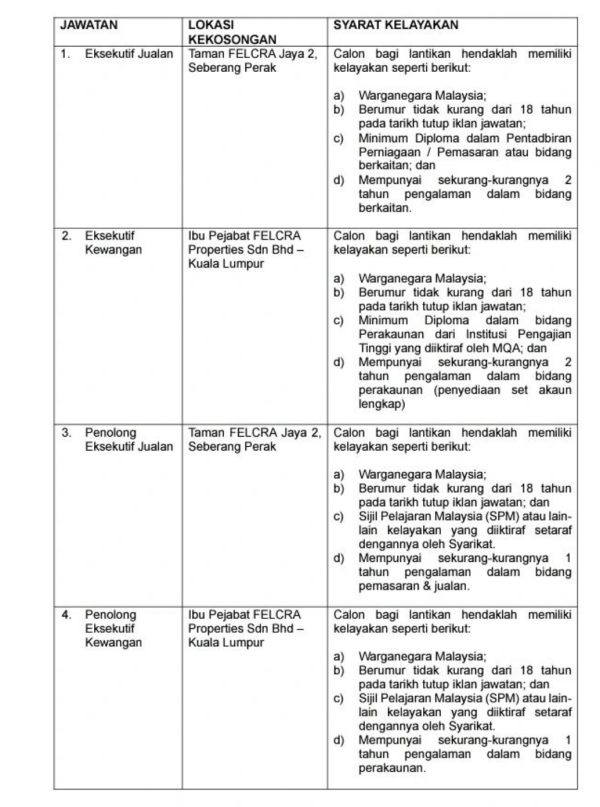 Iklan Jawatan Kosong FELCRA Properties Like serta Ikut Facebook Kami, follow Chanel WhatsApp Jawatan Kosong & Telegram Portal SPA9 untuk capaian pantas kekosongan jawatan daripada kami sekarang.