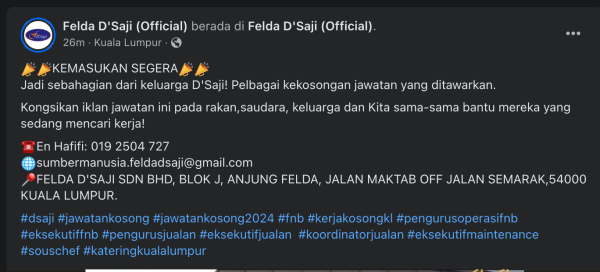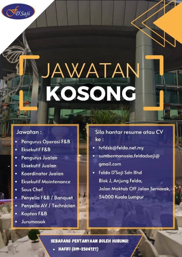 Iklan Jawatan Kosong Felda D’Saji Like serta Ikut Facebook Kami, follow Chanel WhatsApp Jawatan Kosong & Telegram Portal SPA9 untuk capaian pantas kekosongan jawatan daripada kami sekarang.