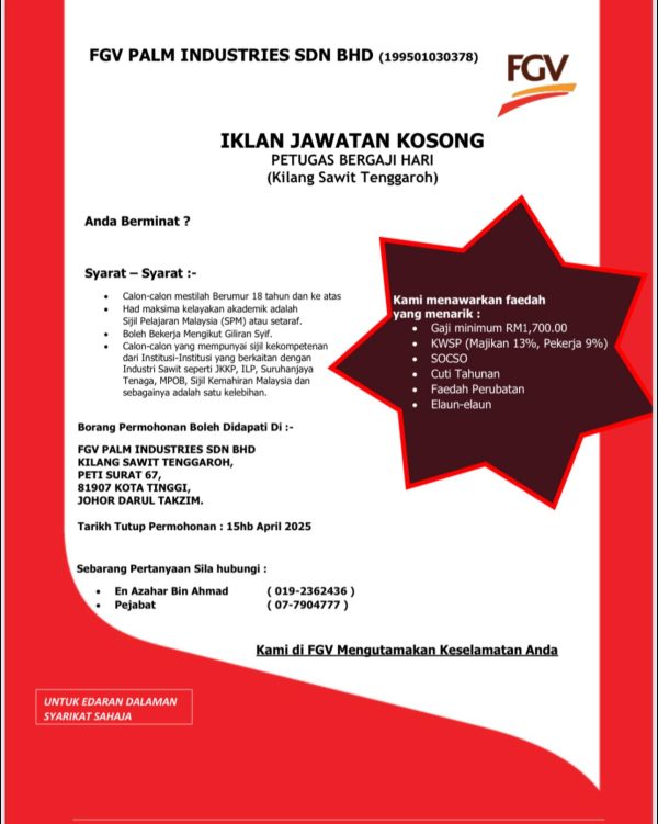 Iklan Jawatan Kosong FGV Palm Industries Sdn Bhd Like serta Ikut Facebook Kami, follow Chanel WhatsApp Jawatan Kosong & Telegram Portal SPA9 untuk capaian pantas kekosongan jawatan daripada kami sekarang.