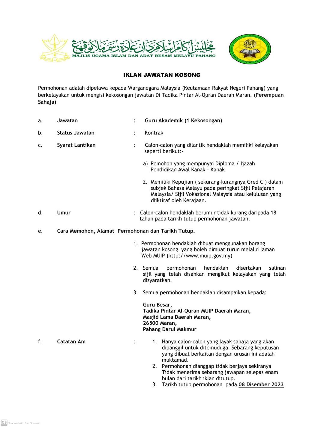 Iklan Jawatan Kosong Guru Akademik Di Tadika Pintar Al-Quran MUIP Like serta Ikut Facebook Kami, follow Chanel WhatsApp Jawatan Kosong & Telegram Portal SPA9 untuk capaian pantas kekosongan jawatan daripada kami sekarang.