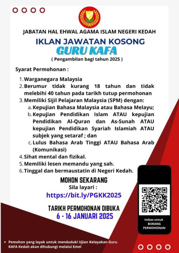 Iklan Jawatan Kosong Guru KAFA Jabatan Hal Ehwal Agama Islam Negeri Kedah Like serta Ikut Facebook Kami, follow Chanel WhatsApp Jawatan Kosong & Telegram Portal SPA9 untuk capaian pantas kekosongan jawatan daripada kami sekarang.