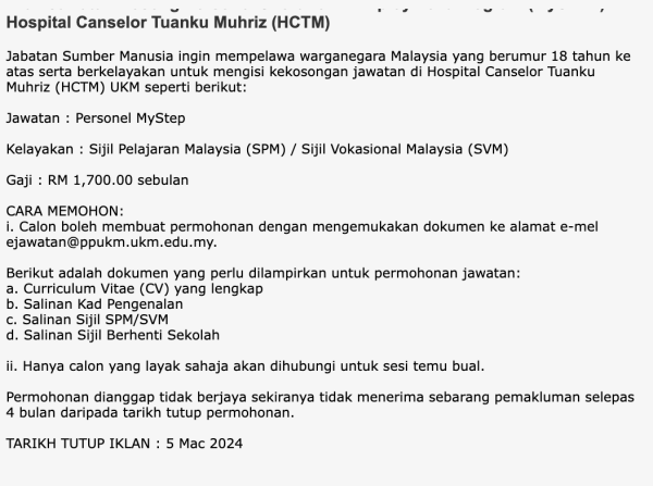 Iklan Jawatan Kosong Hospital Canselor Tuanku Muhriz (HCTM) UKM Like serta Ikut Facebook Kami, follow Chanel WhatsApp Jawatan Kosong & Telegram Portal SPA9 untuk capaian pantas kekosongan jawatan daripada kami sekarang. Klik Jawatan Disini