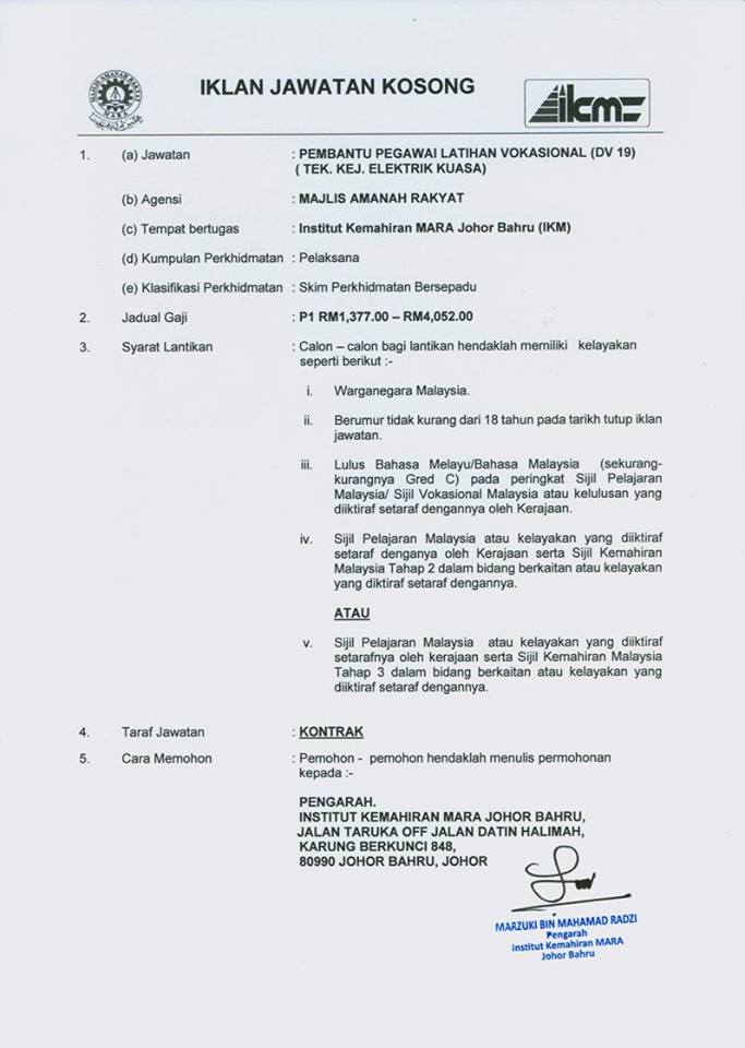 Iklan Jawatan Kosong Institut Kemahiran MARA (IKM)