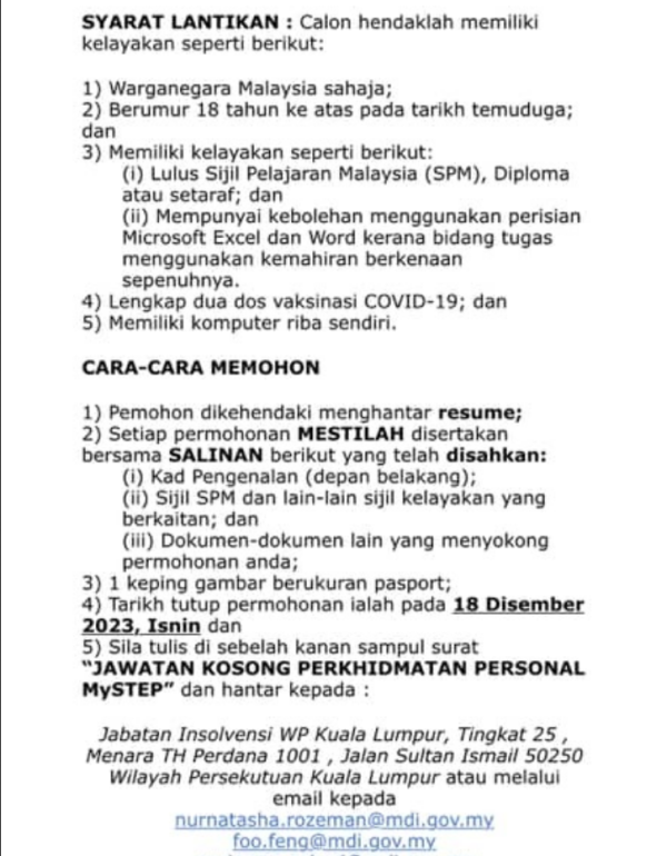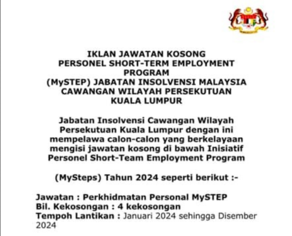 Iklan Jawatan Kosong Jabatan Insolvensi Malaysia Mystep Like serta Ikut Facebook Kami, follow Chanel WhatsApp Jawatan Kosong & Telegram Portal SPA9 untuk capaian pantas kekosongan jawatan daripada kami sekarang.