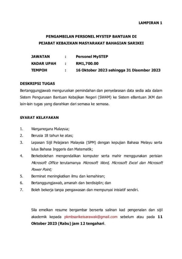 Iklan Jawatan Kosong Jabatan Kebajikan Masyarakat (JKM) Sarikei Like serta Ikut Facebook Kami, follow Chanel WhatsApp Jawatan Kosong & Telegram Portal SPA9 untuk capaian pantas kekosongan jawatan daripada kami sekarang.