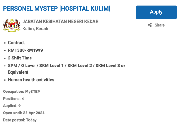 Permohonan jawatan ini boleh dibuat melalui Portal MyFutureJobs. Sila ke Portal MyFutureJobs dan Masukkan Kata Carian yang ingin dicari “JABATAN KESIHATAN NEGERI KEDAH” di bahagian carian untuk memohon jawatan yang diiklankan.