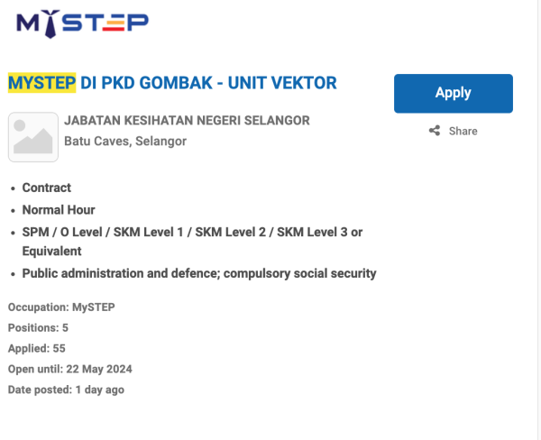 Permohonan jawatan ini boleh dibuat melalui Portal MyFutureJobs. Sila ke Portal MyFutureJobs dan Masukkan Kata Carian yang ingin dicari “JABATAN KESIHATAN NEGERI SELANGOR” di bahagian carian untuk memohon jawatan yang diiklankan.