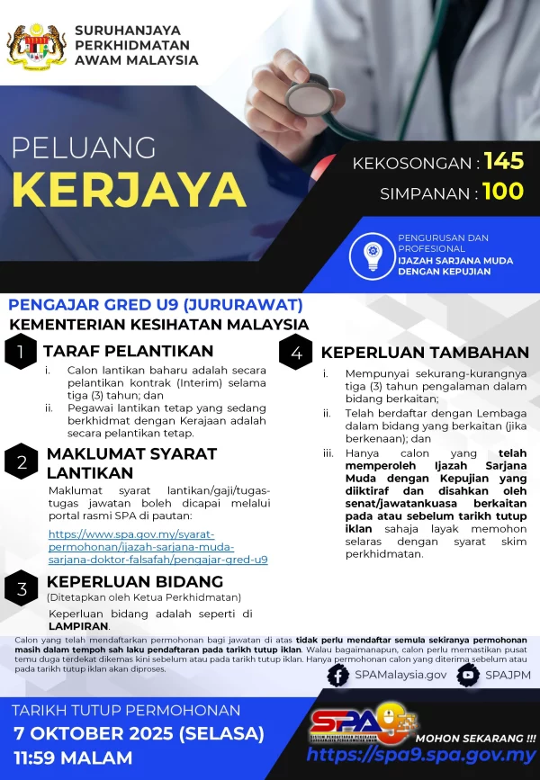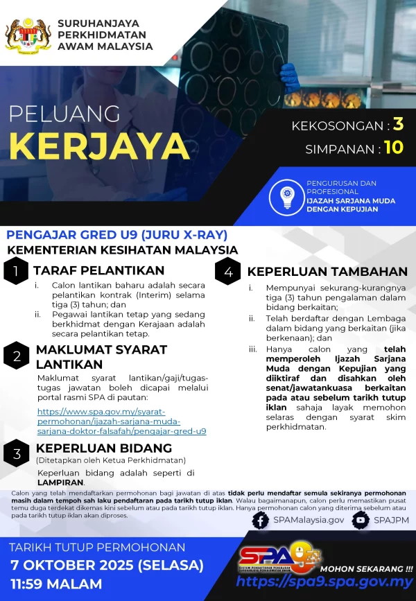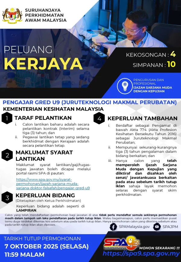 Iklan Jawatan Kosong Kementerian Kesihatan Malaysia (KKM) Like serta Ikut Facebook Kami, follow Chanel WhatsApp Jawatan Kosong & Telegram Portal SPA9 untuk capaian pantas kekosongan jawatan daripada kami sekarang. Klik Iklan Jawatan
