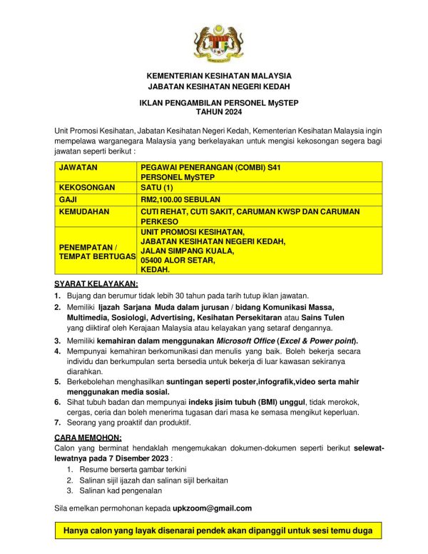Iklan Jawatan Kosong Kementerian Kesihatan Malaysia (KKM) ~ Pegawai Penerangan Like serta Ikut Facebook Kami, follow Chanel WhatsApp Jawatan Kosong & Telegram Portal SPA9 untuk capaian pantas kekosongan jawatan daripada kami sekarang.