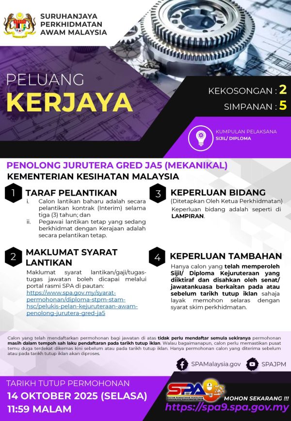 Iklan Jawatan Kosong Kementerian Kesihatan Malaysia (KKM) ~ Penolong Jurutera Gred JA5 (Mekanikal)