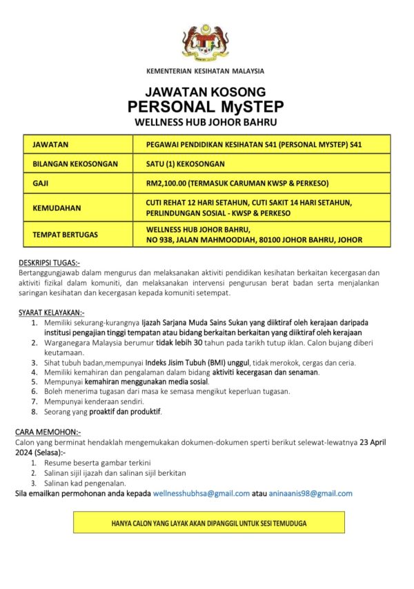 Iklan Jawatan Kosong Kementerian Kesihatan Malaysia Wellness Hub Like serta Ikut Facebook Kami, follow Chanel WhatsApp Jawatan Kosong & Telegram Portal SPA9 untuk capaian pantas kekosongan jawatan daripada kami sekarang.