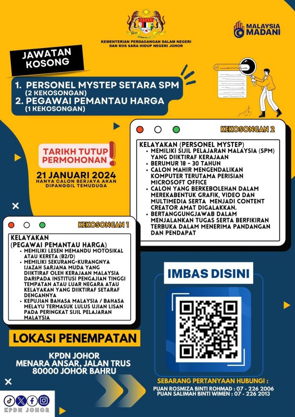 Iklan Jawatan Kosong Kementerian Perdagangan Dalam Negeri Dan Kos Sara Hidup (KPDN) Like serta Ikut Facebook Kami, follow Chanel WhatsApp Jawatan Kosong & Telegram Portal SPA9 untuk capaian pantas kekosongan jawatan daripada kami sekarang.