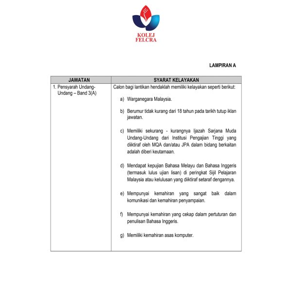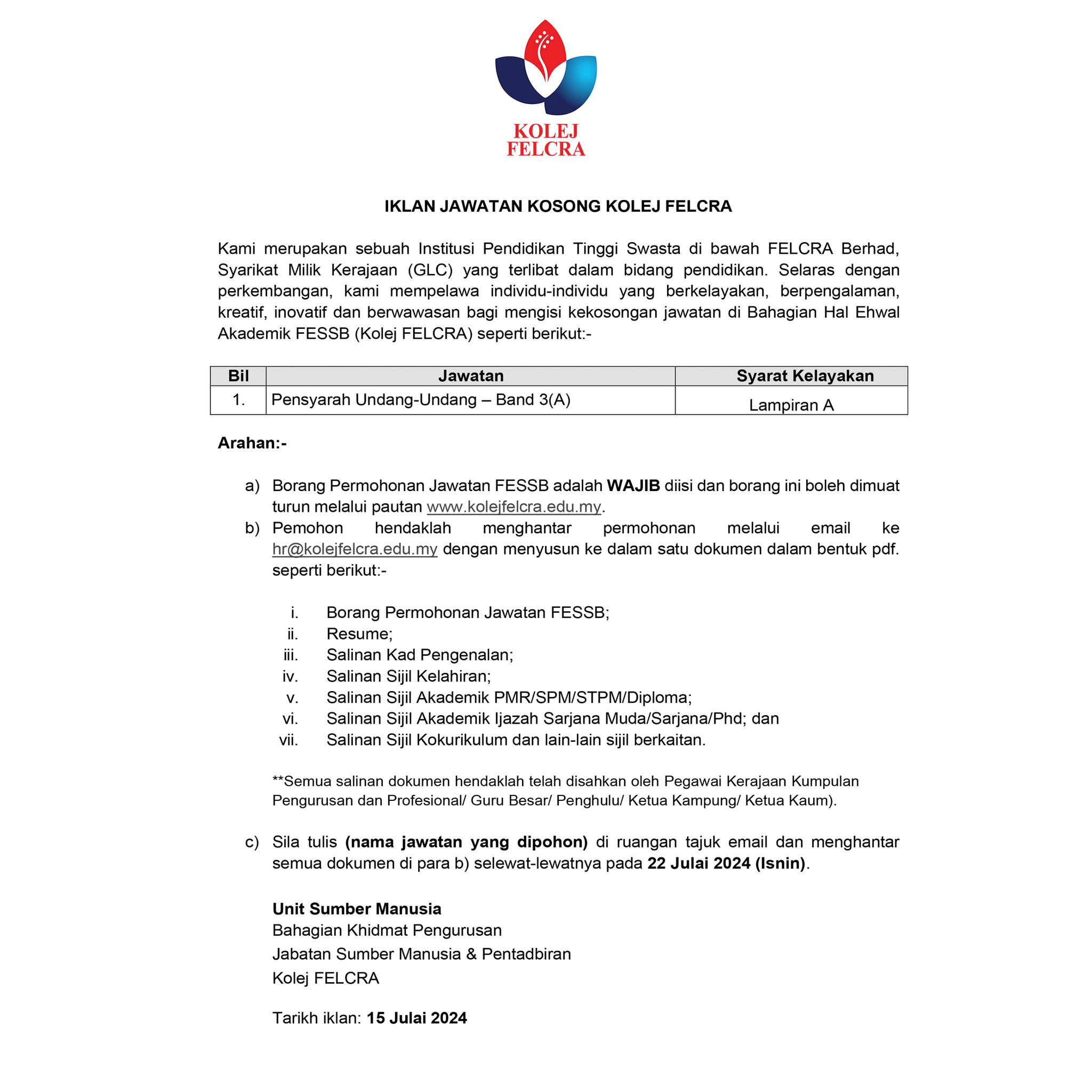Iklan Jawatan Kosong Kolej FELCRA (Bahagian Hal Ehwal Akademik) Klik Jawatan Disini Like serta Ikut Facebook Kami, follow Chanel WhatsApp Jawatan Kosong & Telegram Portal SPA9 untuk capaian pantas kekosongan jawatan daripada kami sekarang.