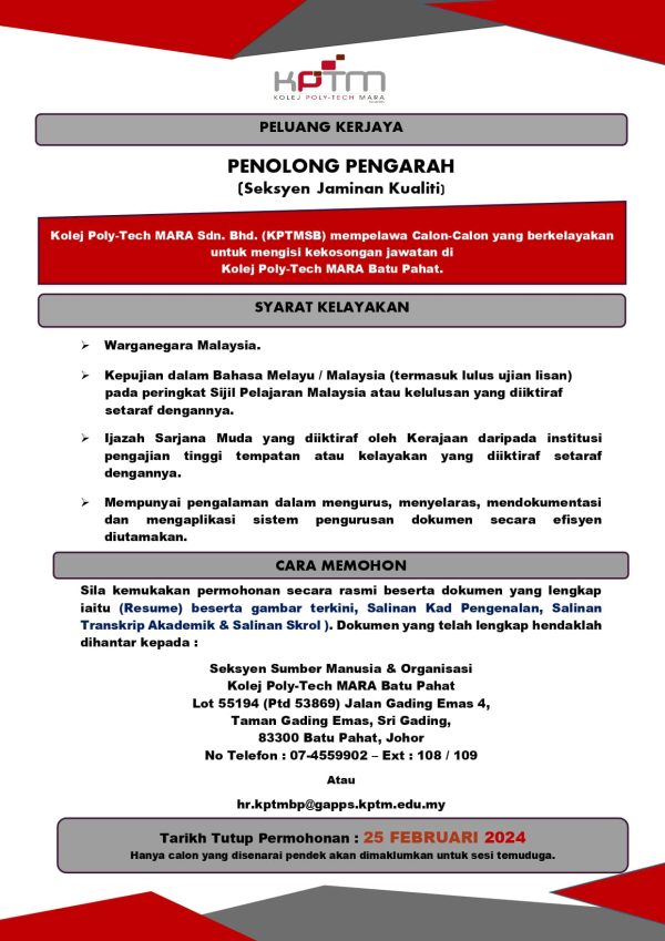 Iklan Jawatan Kosong Kolej Poly-Tech MARA (KPTM) Like serta Ikut Facebook Kami, follow Chanel WhatsApp Jawatan Kosong & Telegram Portal SPA9 untuk capaian pantas kekosongan jawatan daripada kami sekarang.