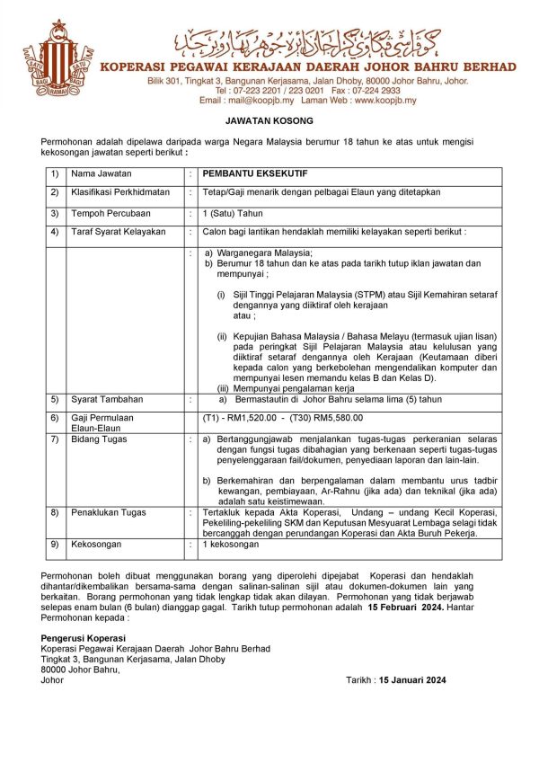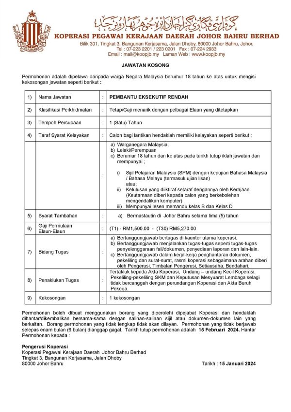 Iklan Jawatan Kosong Koperasi Pegawai Kerajaan Daerah Johor Bahru Berhad Like serta Ikut Facebook Kami, follow Chanel WhatsApp Jawatan Kosong & Telegram Portal SPA9 untuk capaian pantas kekosongan jawatan daripada kami sekarang.