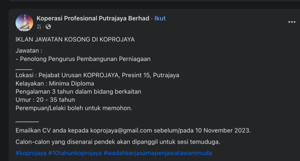 Iklan Jawatan Kosong Koperasi Profesional Putrajaya Berhad Like serta Ikut Facebook Kami, follow Chanel WhatsApp Jawatan Kosong & Telegram Portal SPA9 untuk capaian pantas kekosongan jawatan daripada kami sekarang.