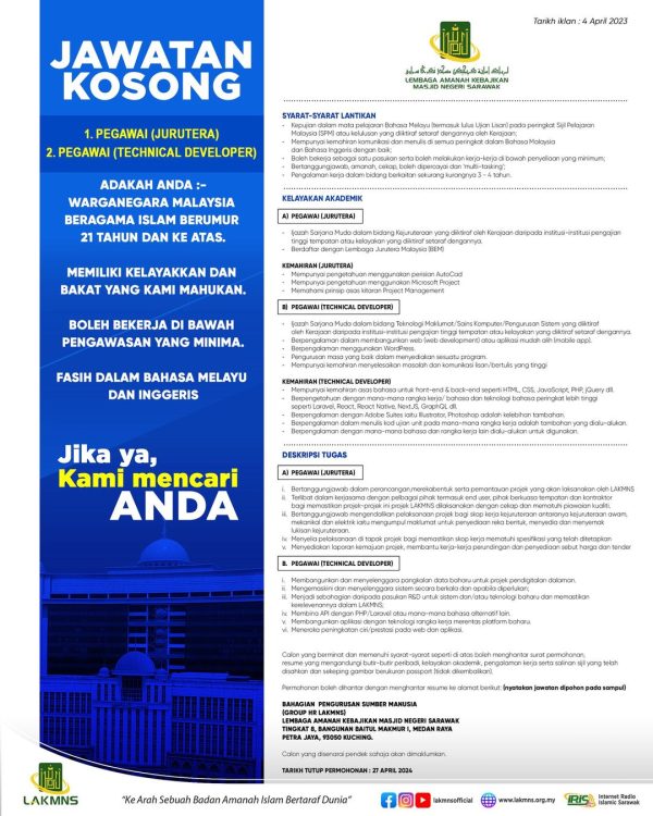 Iklan Jawatan Kosong Lembaga Amanah Kebajikan Masjid Negeri Sarawak