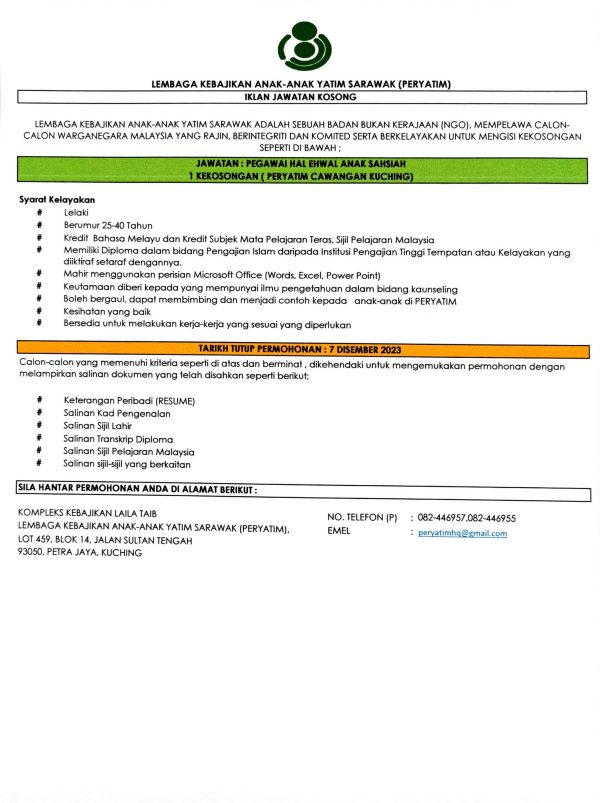 Iklan Jawatan Kosong Lembaga Kebajikan Anak-Anak Yatim Sarawak (PERYATIM)