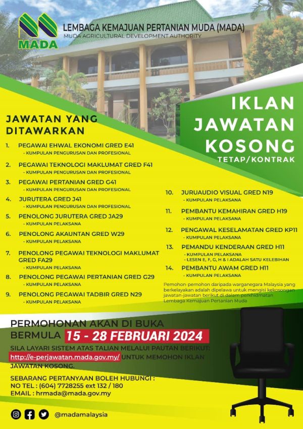 Iklan Jawatan Kosong Lembaga Kemajuan Pertanian Muda (MADA) Like serta Ikut Facebook Kami, follow Chanel WhatsApp Jawatan Kosong & Telegram Portal SPA9 untuk capaian pantas kekosongan jawatan daripada kami sekarang. Klik Jawatan Disini