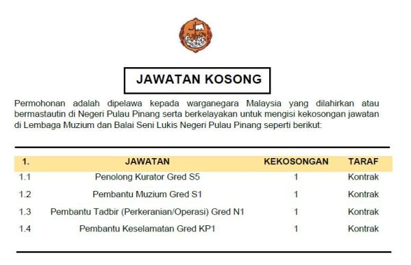 Iklan Jawatan Kosong Lembaga Muzium Negeri Pulau Pinang (LMNPP) Like serta Ikut Facebook Kami, follow Chanel WhatsApp Jawatan Kosong & Telegram Portal SPA9 untuk capaian pantas kekosongan jawatan daripada kami sekarang. Klik Jawatan Disini