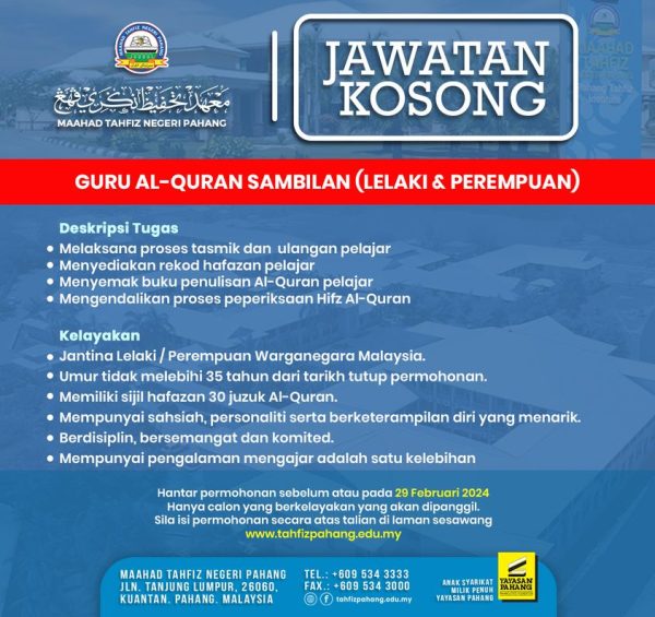 Iklan Jawatan Kosong Maahad Tahfiz Negeri Pahang Like serta Ikut Facebook Kami, follow Chanel WhatsApp Jawatan Kosong & Telegram Portal SPA9 untuk capaian pantas kekosongan jawatan daripada kami sekarang.