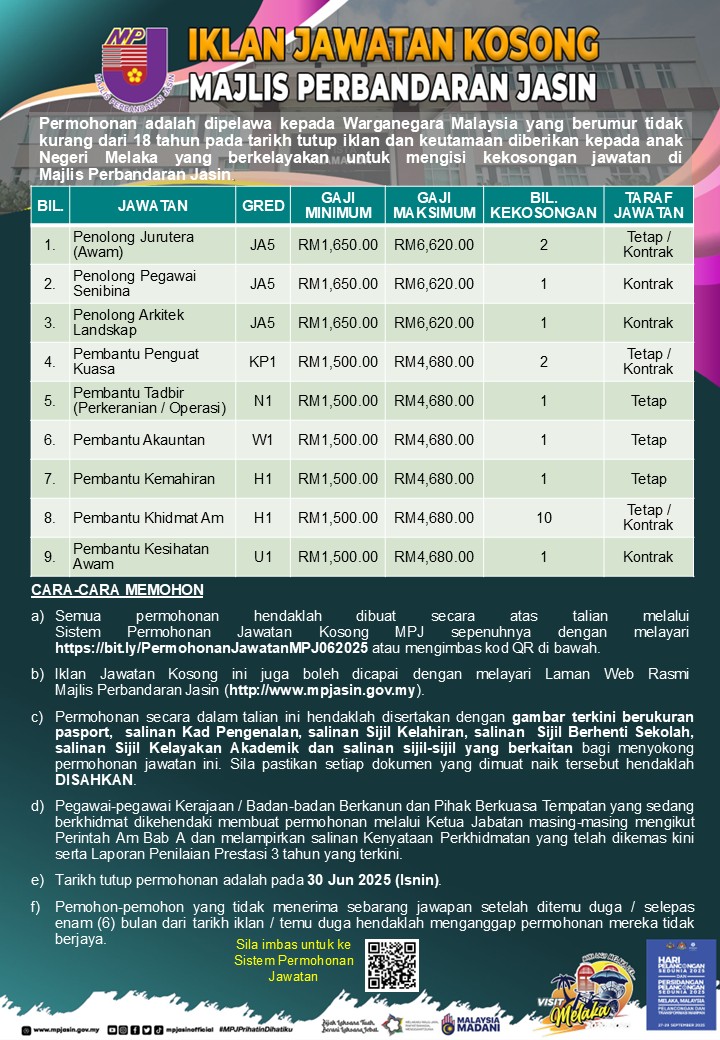 Iklan Jawatan Kosong Majlis Perbandaran Jasin Like serta Ikut Facebook Kami, follow Chanel WhatsApp Jawatan Kosong & Telegram Portal SPA9 untuk capaian pantas kekosongan jawatan daripada kami sekarang. Klik Jawatan Disini