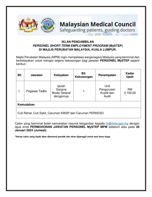 Iklan Jawatan Kosong Majlis Perubatan Malaysia (MMC) Like serta Ikut Facebook Kami, follow Chanel WhatsApp Jawatan Kosong & Telegram Portal SPA9 untuk capaian pantas kekosongan jawatan daripada kami sekarang. Klik Jawatan Disini