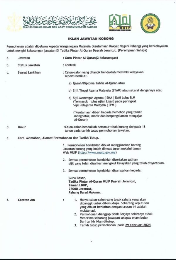 Iklan Jawatan Kosong Majlis Ugama Islam & Adat Resam Melayu Pahang (MUIP) Like serta Ikut Facebook Kami, follow Chanel WhatsApp Jawatan Kosong & Telegram Portal SPA9 untuk capaian pantas kekosongan jawatan daripada kami sekarang. Klik Jawatan Disini
