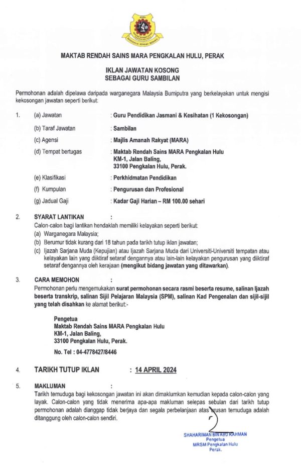 Iklan Jawatan Kosong Maktab Rendah Sains MARA (MRSM) Pengkalan Hulu Like serta Ikut Facebook Kami, follow Chanel WhatsApp Jawatan Kosong & Telegram Portal SPA9 untuk capaian pantas kekosongan jawatan daripada kami sekarang.