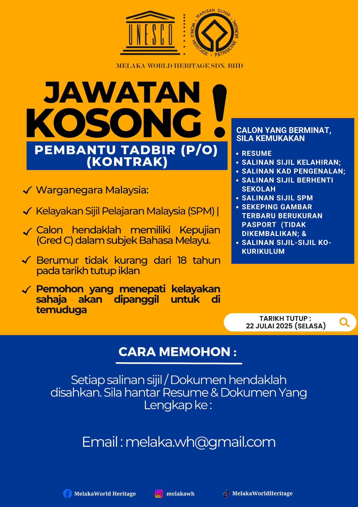 Iklan Jawatan Kosong Melaka World Heritage Like serta Ikut Facebook Kami, follow Chanel WhatsApp Jawatan Kosong & Telegram Portal SPA9 untuk capaian pantas kekosongan jawatan daripada kami sekarang. Klik Jawatan Disini