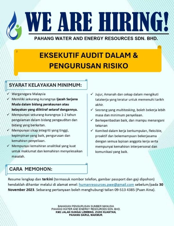 Iklan Jawatan Kosong Pahang Water And Energy Resources Sdn Bhd Like serta Ikut Facebook Kami, follow Chanel WhatsApp Jawatan Kosong & Telegram Portal SPA9 untuk capaian pantas kekosongan jawatan daripada kami sekarang.