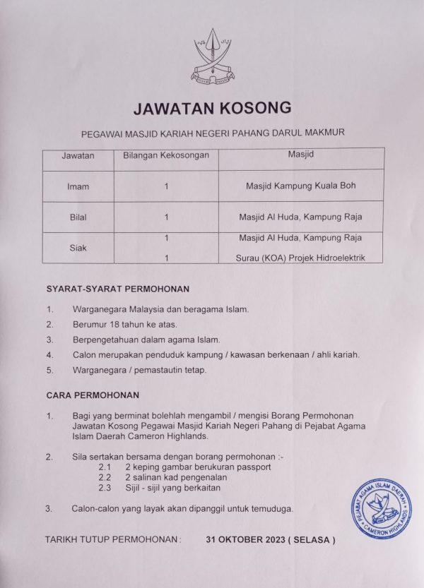 Iklan Jawatan Kosong Pejabat Agama Islam Daerah Cameron Highlands Like serta Ikut Facebook Kami, follow Chanel WhatsApp Jawatan Kosong & Telegram Portal SPA9 untuk capaian pantas kekosongan jawatan daripada kami sekarang.