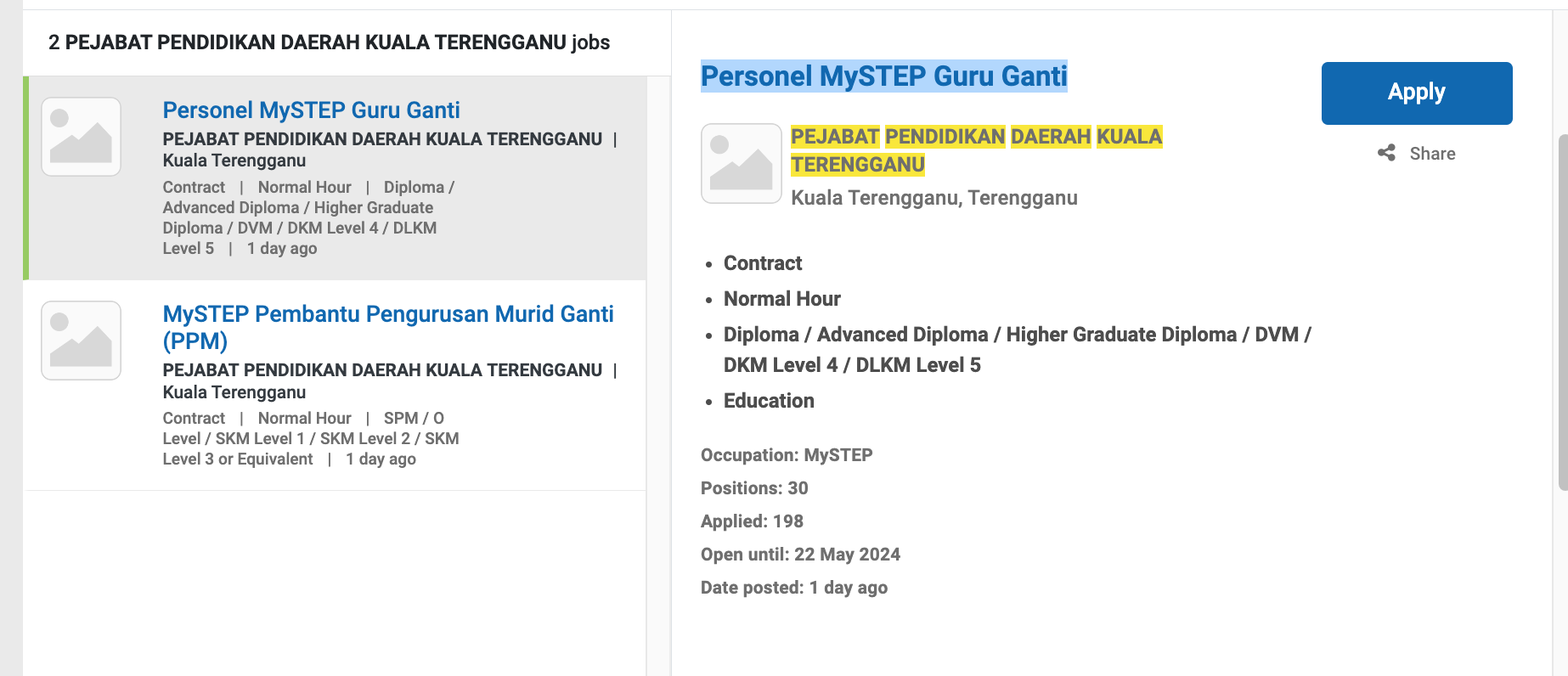 Permohonan jawatan ini boleh dibuat melalui Portal MyFutureJobs. Sila ke Portal MyFutureJobs dan Masukkan Kata Carian yang ingin dicari “PEJABAT PENDIDIKAN DAERAH KUALA TERENGGANU” di bahagian carian untuk memohon jawatan yang diiklankan.