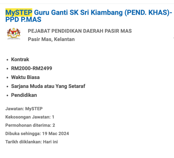 Iklan Jawatan Kosong Pejabat Pendidikan Daerah Pasir Mas