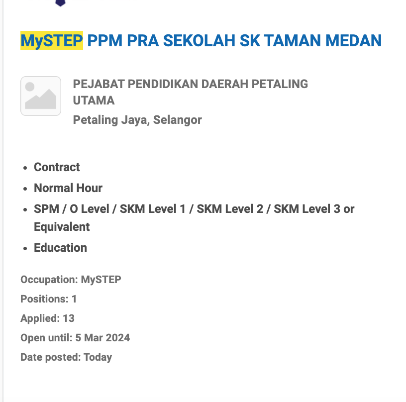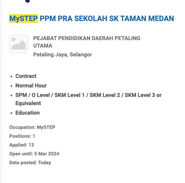 Permohonan jawatan ini boleh dibuat melalui Portal MyFutureJobs. Sila ke Portal MyFutureJobs dan Masukkan Kata Carian yang ingin dicari “PEJABAT PENDIDIKAN DAERAH PETALING UTAMA” di bahagian carian untuk memohon jawatan yang diiklankan.