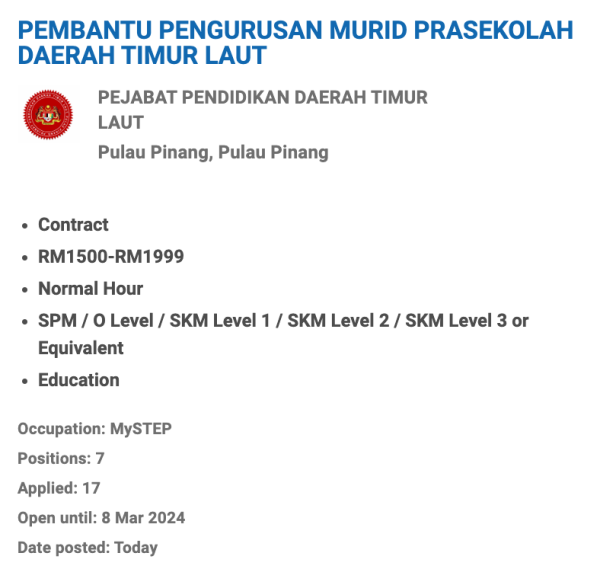 Iklan Jawatan Kosong Pejabat Pendidikan Daerah Timur Laut