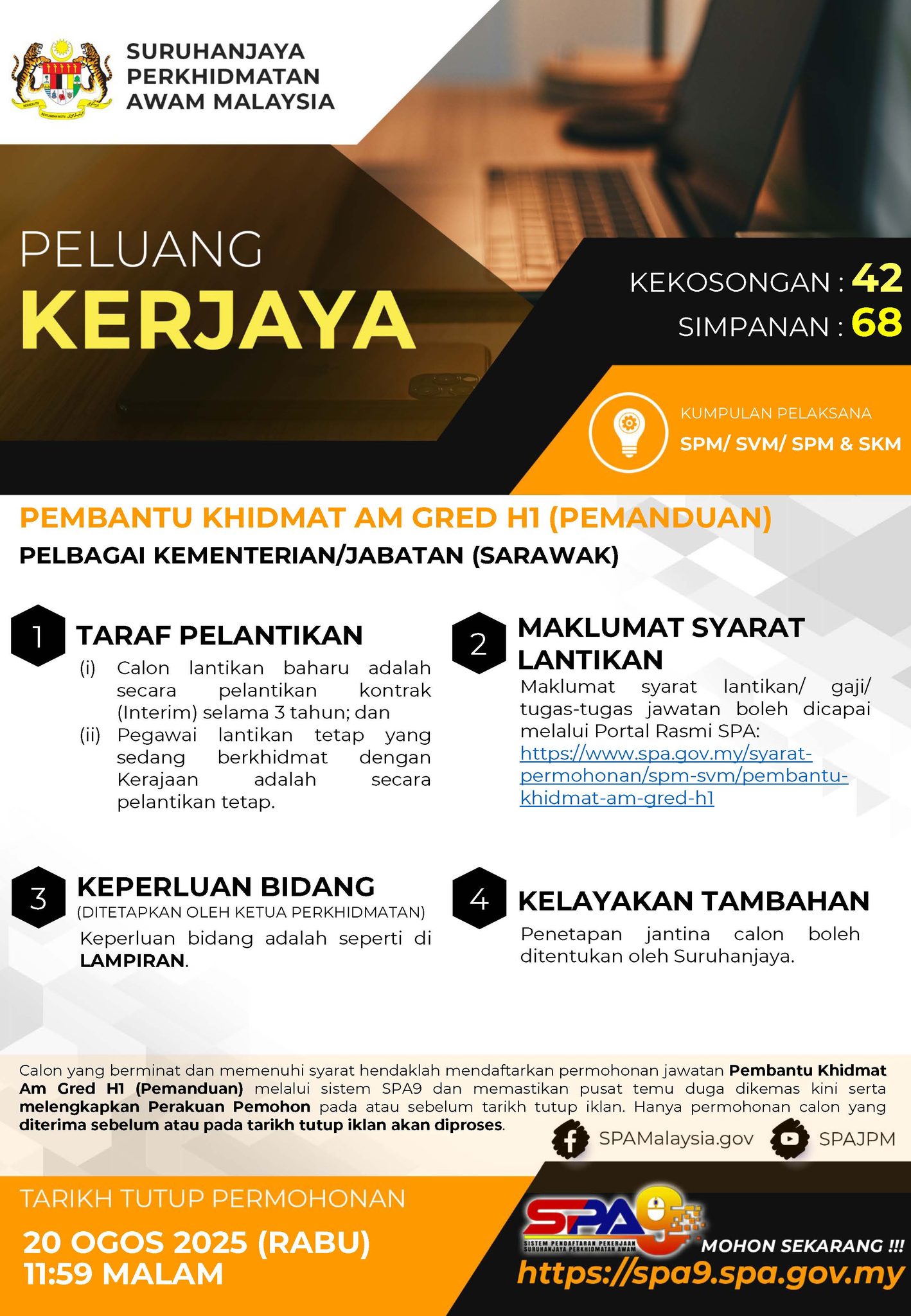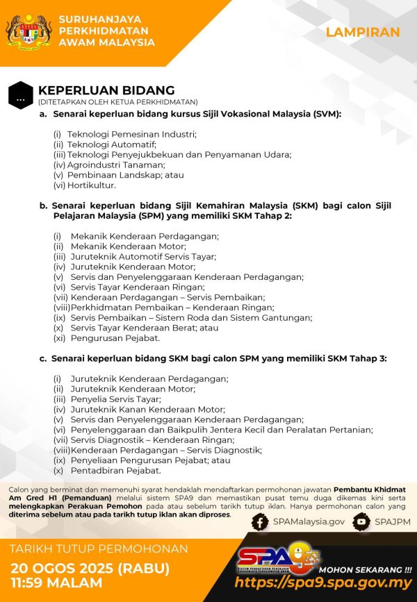 Iklan Jawatan Kosong Pelbagai Kementerian/Jabatan ~ Pembantu Khidmat Am Gred H1 (Pemanduan) Like serta Ikut Facebook Kami, follow Chanel WhatsApp Jawatan Kosong & Telegram Portal SPA9 untuk capaian pantas kekosongan jawatan daripada kami sekarang. Klik Jawatan Disini