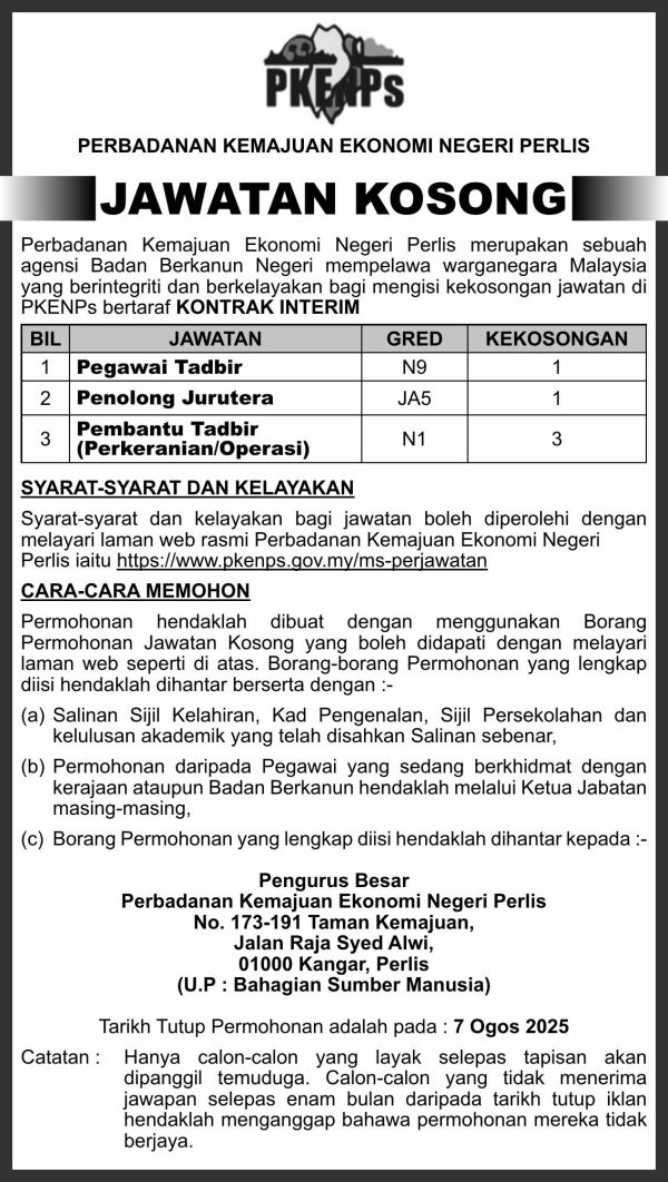 Iklan Jawatan Kosong Perbadanan Kemajuan Ekonomi Negeri Perlis (PKENPs) Like serta Ikut Facebook Kami, follow Chanel WhatsApp Jawatan Kosong & Telegram Portal SPA9 untuk capaian pantas kekosongan jawatan daripada kami sekarang.