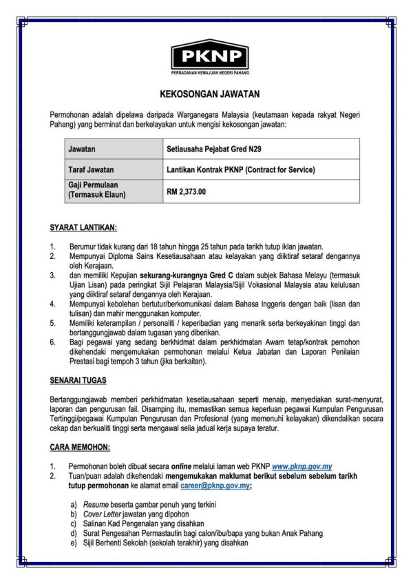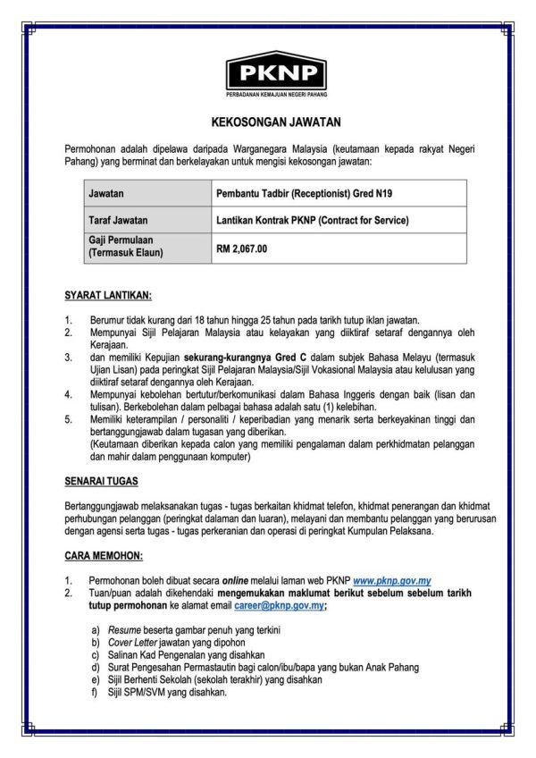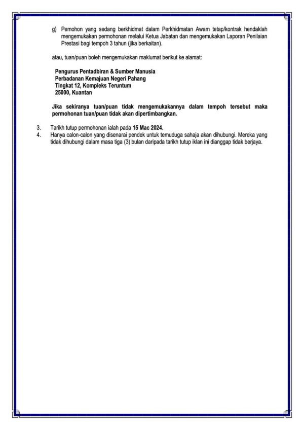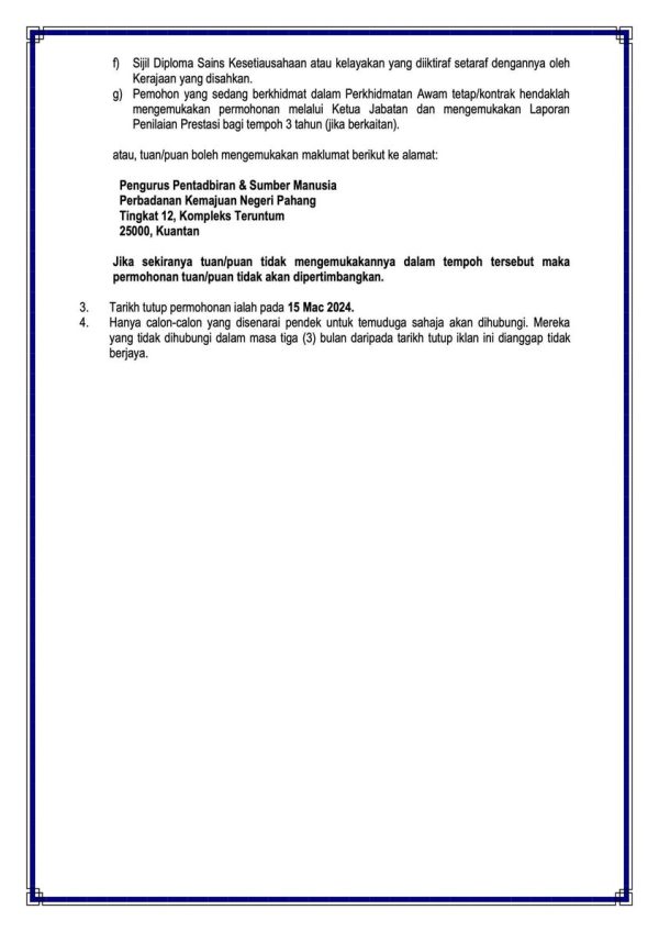 Iklan Jawatan Kosong Perbadanan Kemajuan Negeri Pahang x Like serta Ikut Facebook Kami, follow Chanel WhatsApp Jawatan Kosong & Telegram Portal SPA9 untuk capaian pantas kekosongan jawatan daripada kami sekarang.