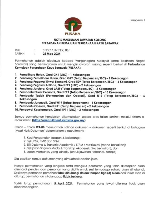 Iklan Jawatan Kosong Perbadanan Kemajuan Perusahaan Kayu Sarawak (PUSAKA) Like serta Ikut Facebook Kami, follow Chanel WhatsApp Jawatan Kosong & Telegram Portal SPA9 untuk capaian pantas kekosongan jawatan daripada kami sekarang. Klik Jawatan Disini