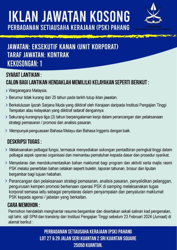 Iklan Jawatan Kosong Perbadanan Setiausaha Kerajaan (Psk) Pahang Like serta Ikut Facebook Kami, follow Chanel WhatsApp Jawatan Kosong & Telegram Portal SPA9 untuk capaian pantas kekosongan jawatan daripada kami sekarang. Klik Jawatan Disini