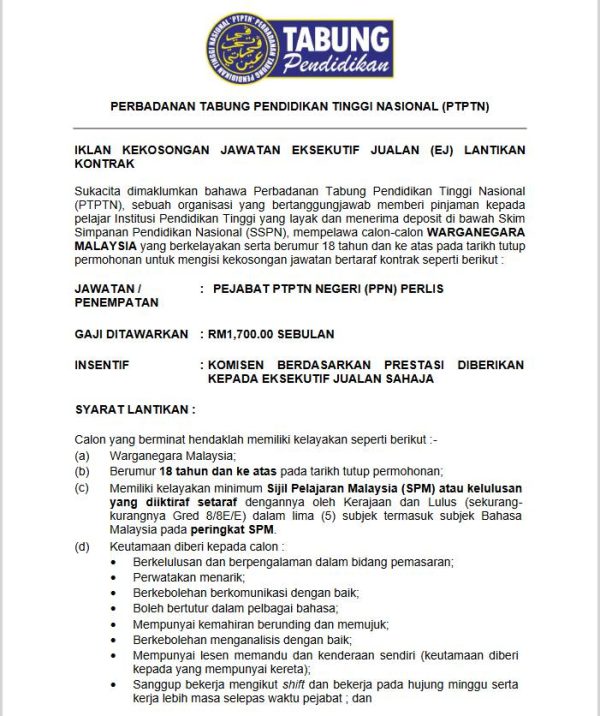 Iklan Jawatan Kosong Perbadanan Tabung Pendidikan Tinggi Nasional (PTPTN)